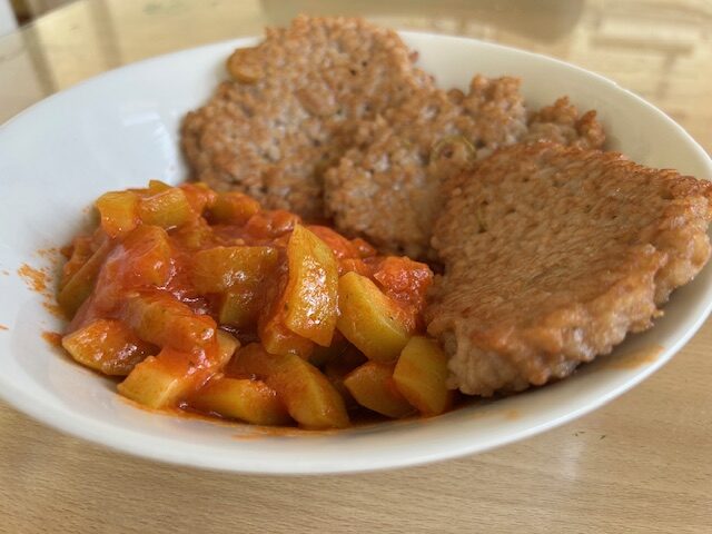 Zelf heb ik er licht gebakken stukjes courgette in tomatensaus bij gegeten. Voor mij was dat een fijne combinatie. Zie bij sausen hoe de tomatensaus te maken.